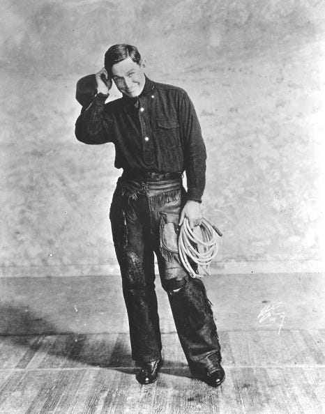 Today is the birthday of cowboy poet and humorist Will Rogers (1879). He was born on a ranch near Oologah, Oklahoma, although Oklahoma was still the Cherokee Nation at that time. Growing up on a cattle ranch, it's not too surprising that he learned how to throw a lasso, but Rogers took it a step further. He made it into the Guinness Book of World Records for throwing three lassos at once to rope a galloping horse and rider: one rope went around the horse's neck, the second went around the rider, and the third captured the horse's legs. His trick roping skills are featured in a movie, The Ropin' Fool (1922), and he was popular in Wild West shows and on the vaudeville circuit. He also had a knack for wisecracks, and soon those became part of his act as well. He appeared in several Broadway shows and about 70 movies. He also wrote six books and a popular syndicated newspaper column, "Will Rogers Says," which reached 40 million readers.