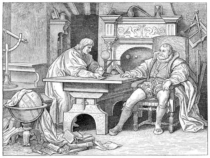 Today is the birthday of German astronomer Johannes Kepler, born in Weil der Stadt, Württemberg (1571), who intended to become a theologian but then read Copernicus's Six Books Concerning the Revolutions of the Heavenly Orbs, in which Copernicus posits that the planets revolve around the Sun, not the Earth. Kepler saw Copernicus's theory as evidence of a divine blueprint for the universe, and set out to prove the theories through scientific observation. He wrote a defense of Copernicus called The Cosmographic Mystery (1596) and over his lifetime, Kepler came up with three laws of planetary motion. He published two of them in New Astronomy (1609), stating first, that the planets travel in elliptical orbits around the Sun; and second, that an imaginary line joining the planet and the Sun would sweep out equal areas during equal periods of time — in other words, the planet moves faster during the portion of its orbit that is closest to the Sun. His final law, published in Harmonies of the World (1619), describes the mathematical relationship between the distance of a planet from the Sun and the length of the planet's orbital period.